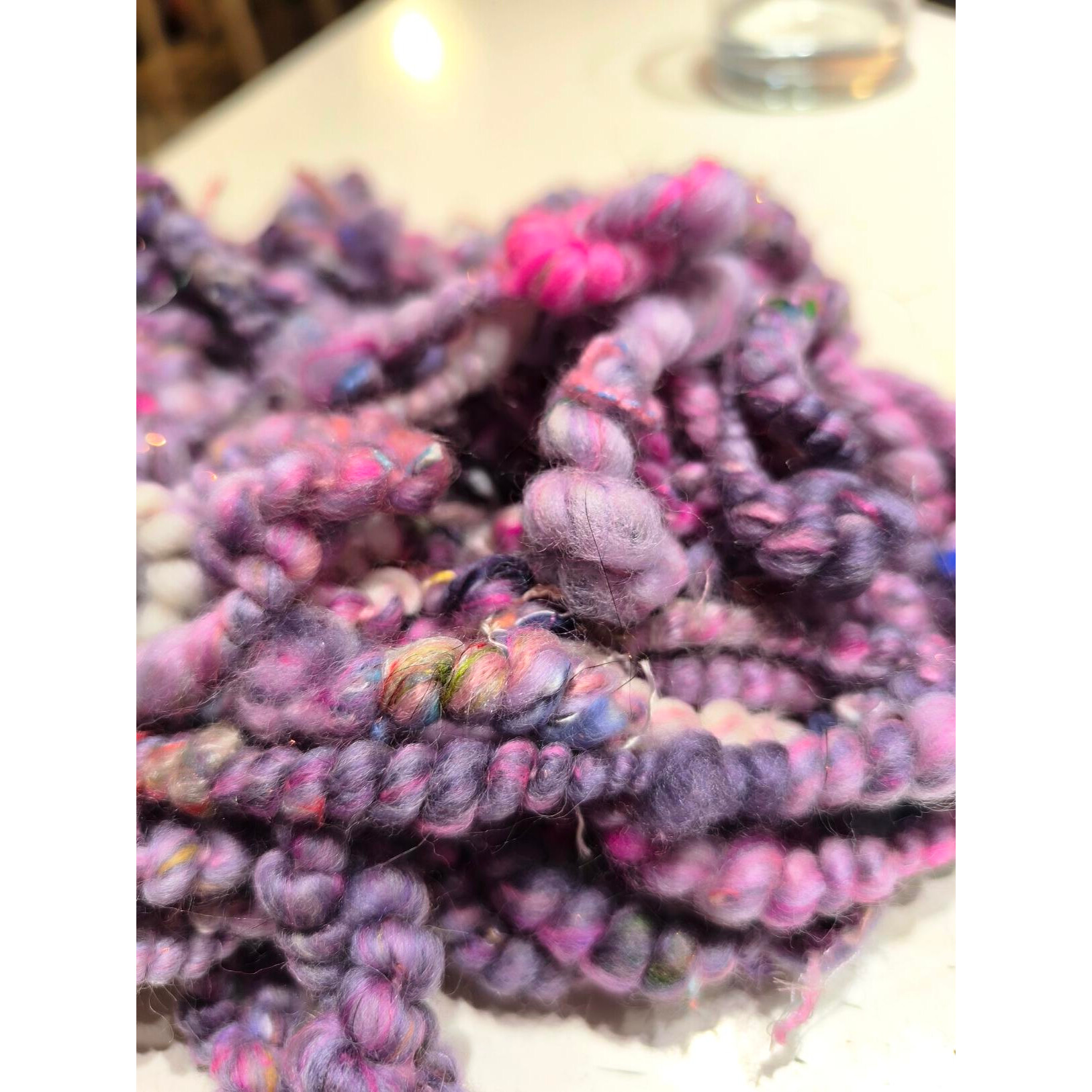 Απαλό, ζεστό και με πλούσια, ανάγλυφη υφή χειροποίητο art yarn σε αποχρώσεις του μωβ με πινελιές ροζ.”