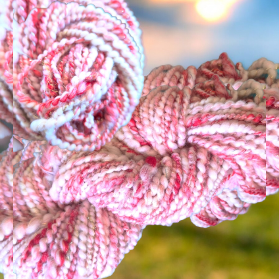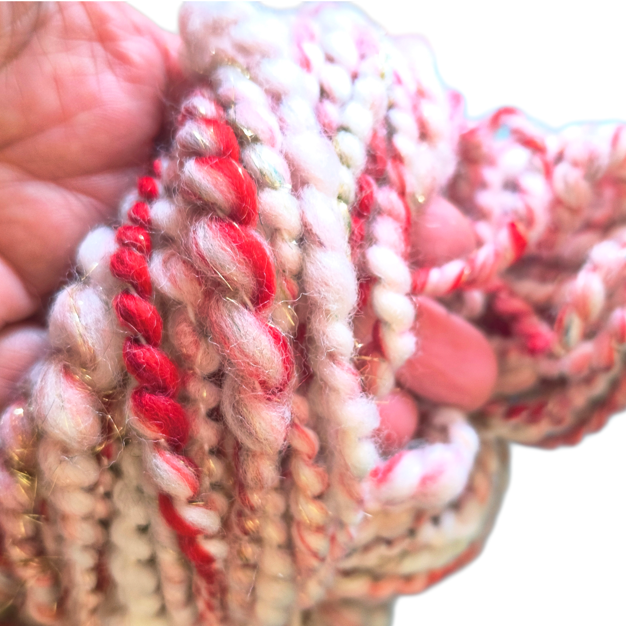 Χειροποίητο γνεσμένο νήμα σε αποχρώσεις κρεμ-λευκού και βαθύ κερασί — μια χρωματική σύνθεση που θυμίζει παγωτό βανίλια με κεράσι.