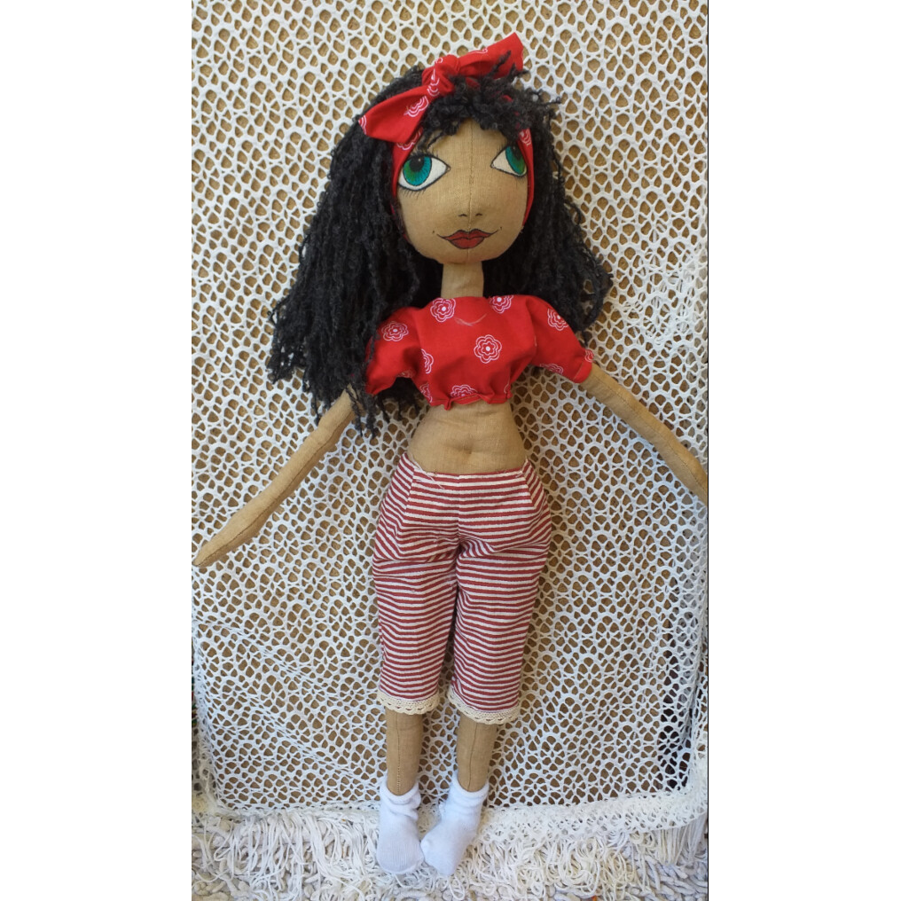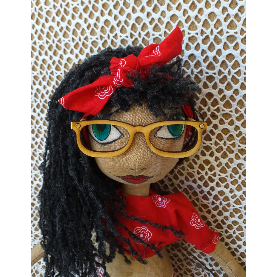 Το πρόσωπο ζωγραφισμένο στο χέρι με βαφές ειδικές για ύφασμα., Τα μαλλιά της κούκλας δημιουργήθηκαν από μαλλί αλπακά.