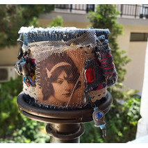 Μέγεθος Υλικά :ανακυκλωμένο Τζην , δαντέλες, μεταλλικά στοιχεία με πέτρες,vintage υφασματοποιημένη φωτογραφία,κουμπί vintage ,υφασμάτινη χάνδρα. Μοναδικό Χειροποίητο!!