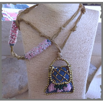 Κρεμαστό λαιμού σε στυλ μικρής τσάντας κεντημένο με χάνδρες. Χειροποίητες υφασμάτινες χάνδρες διακοσμούν το κορδόνι λαιμού, Μήκος δερμάτινου κορδονιου 50 εκ ( χ 2) Μοναδικό!