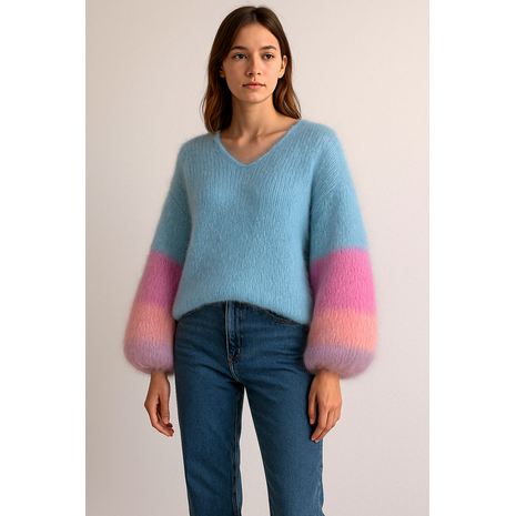 Πλέξτε εύκολα την oversized μπλούζα mohair με λαιμόκοψη V, ακολουθώντας τις αναλυτικές οδηγίες και τα σχεδιαγράμματα που περιλαμβάνονται στο πατρόν.