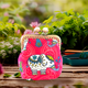 Χειροποίητο Πορτοφολάκι Kiss Lock με Γάτες – Βαμβακερό Υφασμάτινο Πορτοφολάκι με Ασημί Πλαίσιο και Μωβ Μπίλιες (12×10 cm)