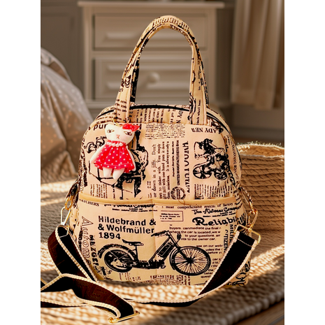 Φέρει κοντά υφασμάτινα χερούλια (37 εκ.) και μακριά ρυθμιζόμενη καφέ-μπεζ λουρίδα (έως 1,30 μ.), ώστε να φοριέται είτε χιαστί, είτε στον ώμο, είτε να κρατηθεί στο χέρι.
