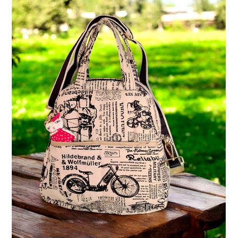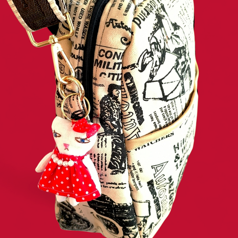 Η τσάντα συνοδεύεται από ένα χειροποίητο charm – γατάκι με κόκκινο πουά φόρεμα, επίσης ραμμένο από τη δημιουργό, που της δίνει παιχνιδιάρικο και μοναδικό χαρακτήρα.