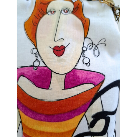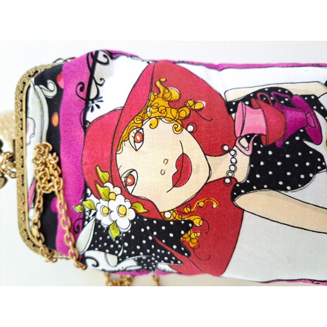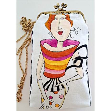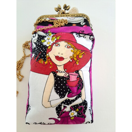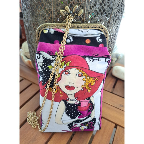 Θήκη κατάλληλη για γυαλιά, τηλέφωνο ή πορτοφόλι. Φτιαγμένο με τυπωμένο ύφασμα απο την συλλογή Loralie designs. ,και μεταλλικό μπρονζέ πλαίσιο Φάρδος 14 εκ, και 'υψος 22 εκ. Μεταλλική μπρονζέ αλυσίδα 1.20 -1.30 εκ....
