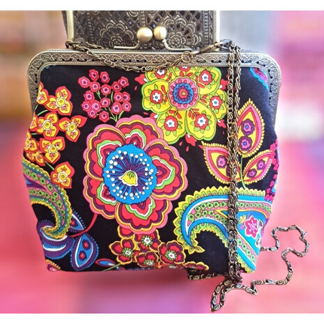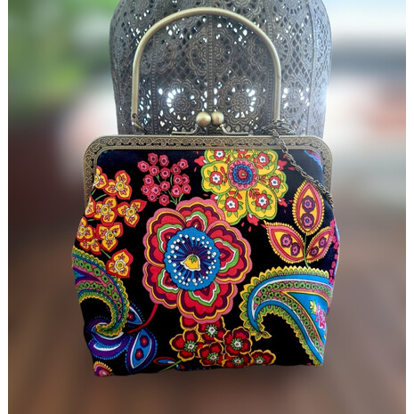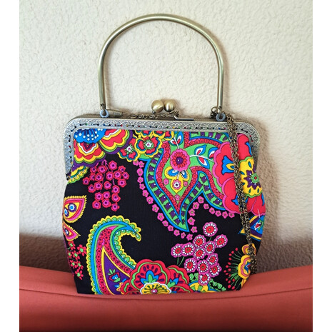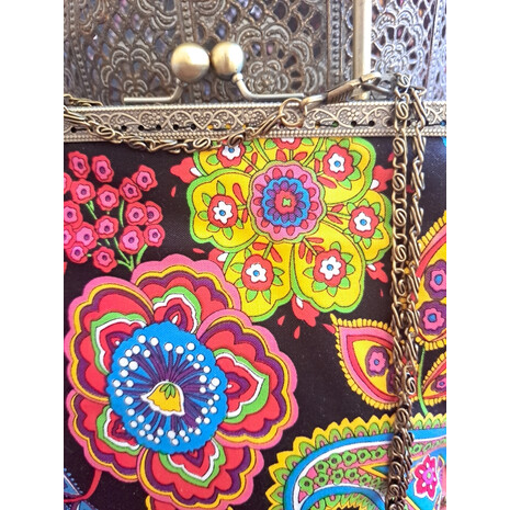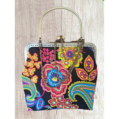 Κομψό , ιδιαίτερο τσαντάκι, φτιαγμένο με ενα πολύ όμορφο vintage βαμβακερό ύφασμα! Μεταλλικό πλάισιο για να κρατηθεί στο χέρι, και έχτρα μπρονζέ αλυσίδα για να περαστεί στον ώμο. Ύφασμα βαμβακερό 100% . εσωτερικά.εχει επενδυθεί με βαμβακερή αφράτη βάτα και φόδρα μαύρου χρώματος...