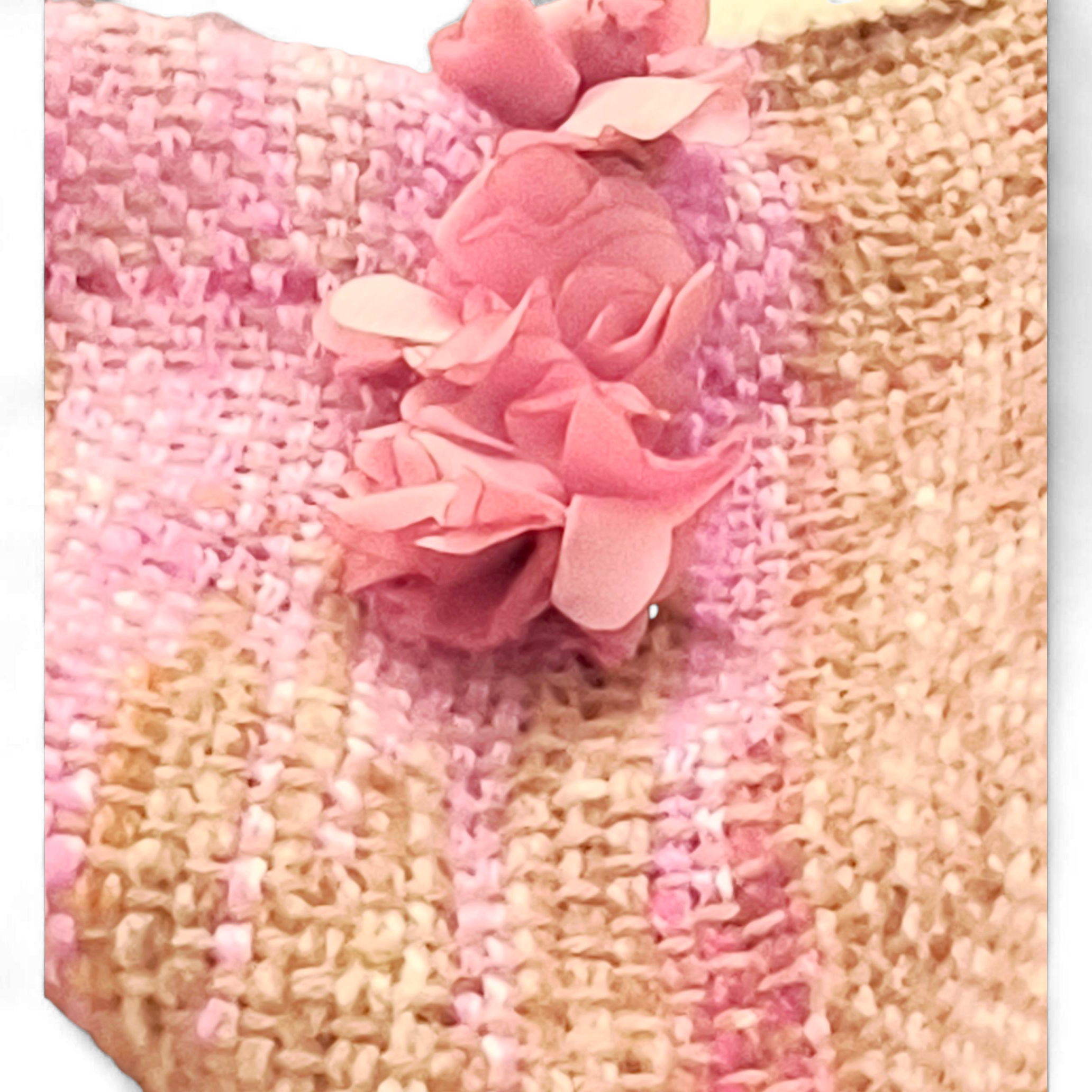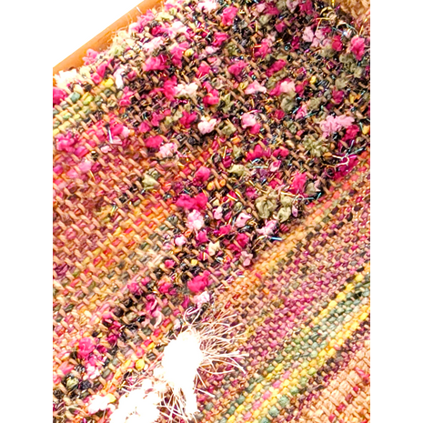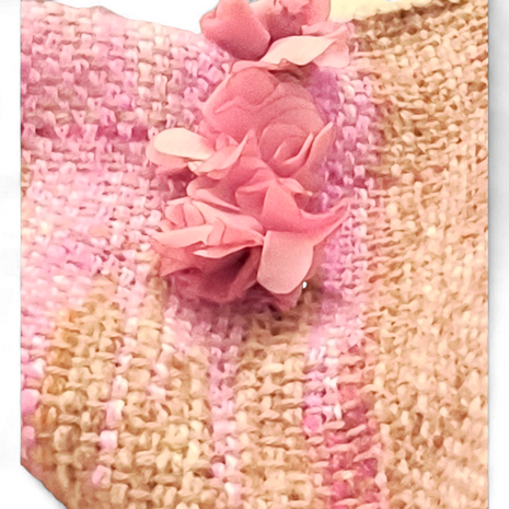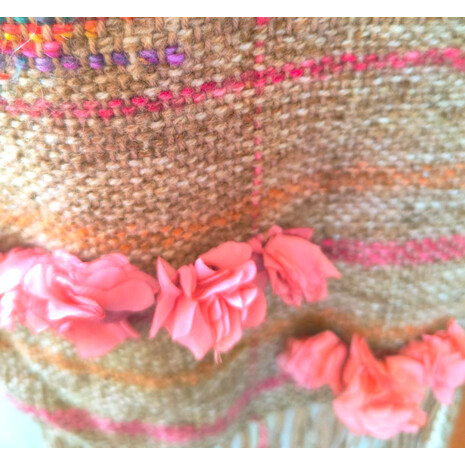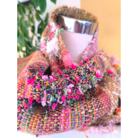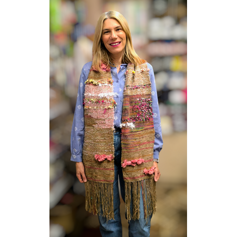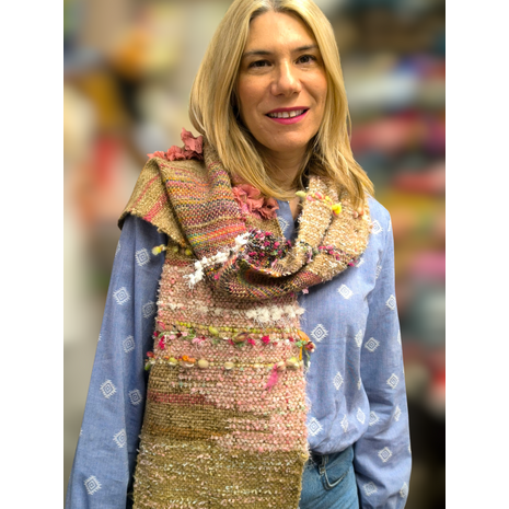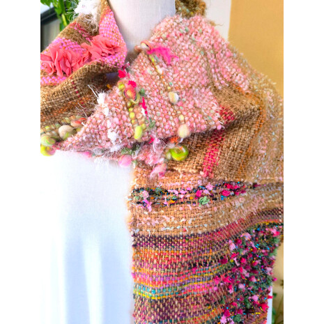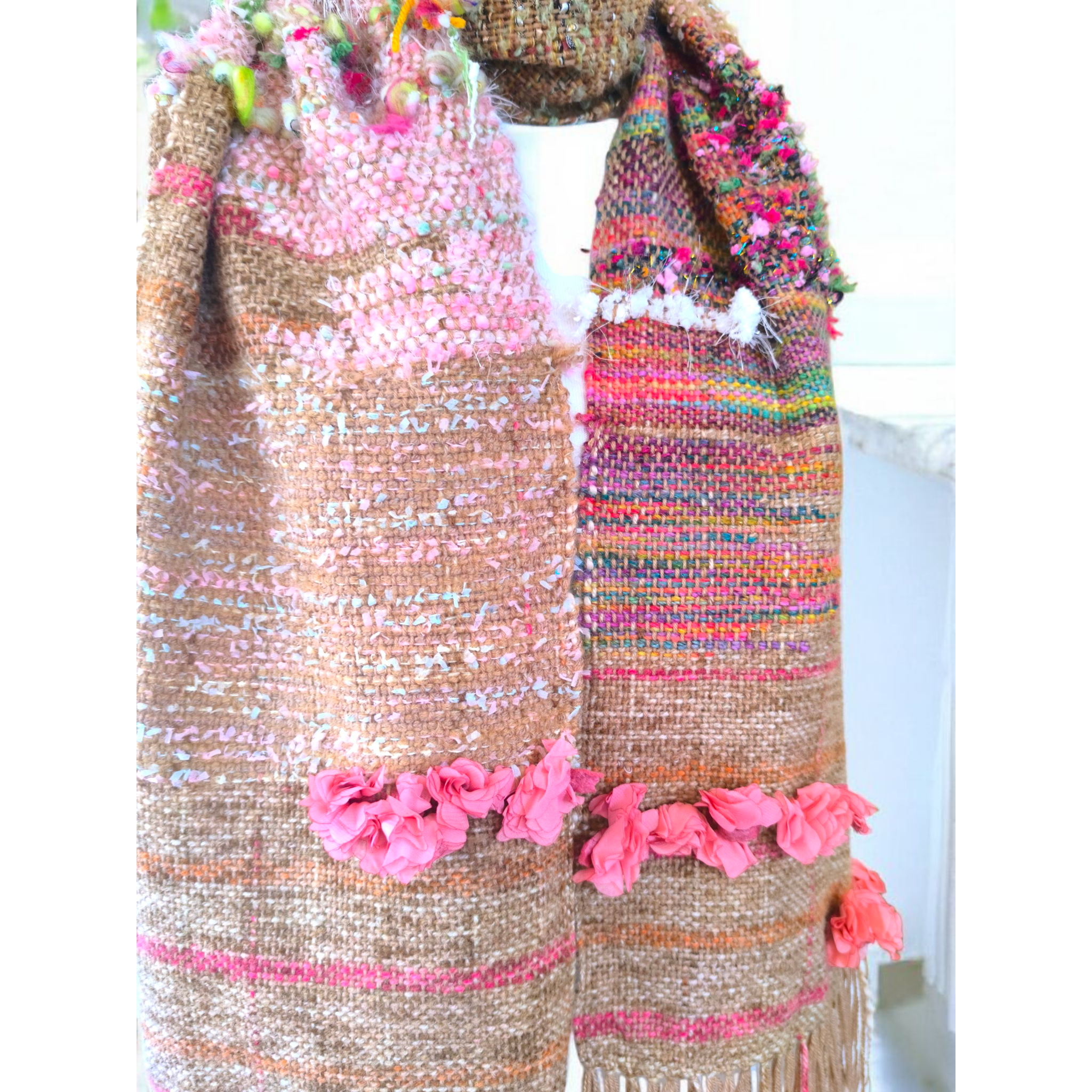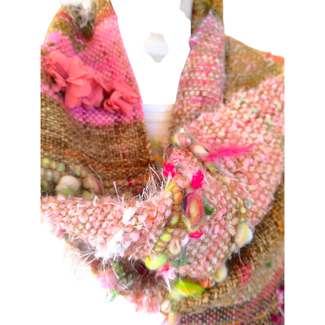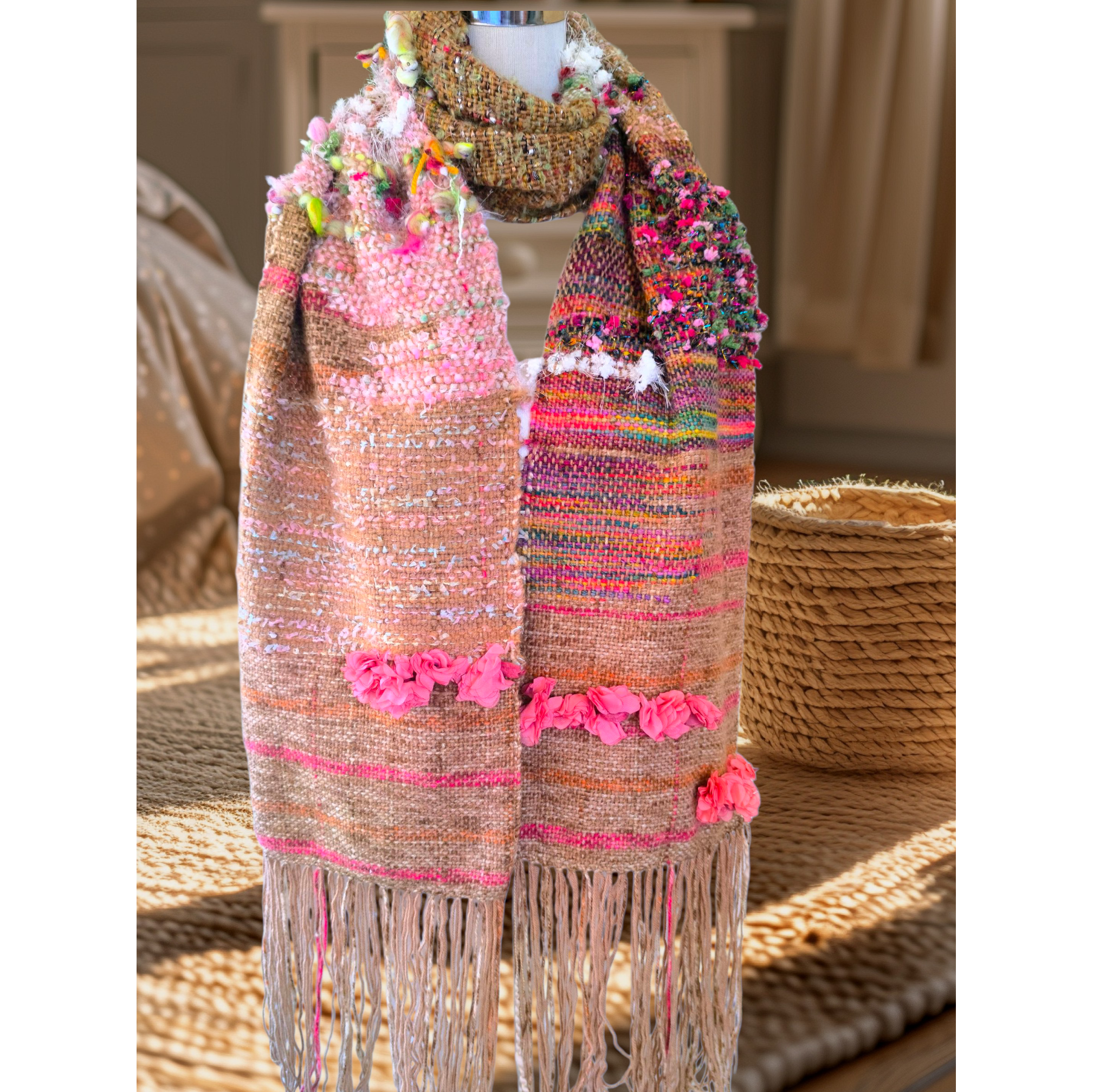 Χειροποίητο υφαντό κασκόλ σε Saori ύφος, υφασμένο σε rigid heddle loom με μίξη υφών και αρμονικών αποχρώσεων. Στο ύφασμα έχουν ενσωματωθεί ροζ υφασμάτινα λουλούδια, προσθέτοντας μια ιδιαίτερη και διακριτική διακοσμητική λεπτομέρεια.